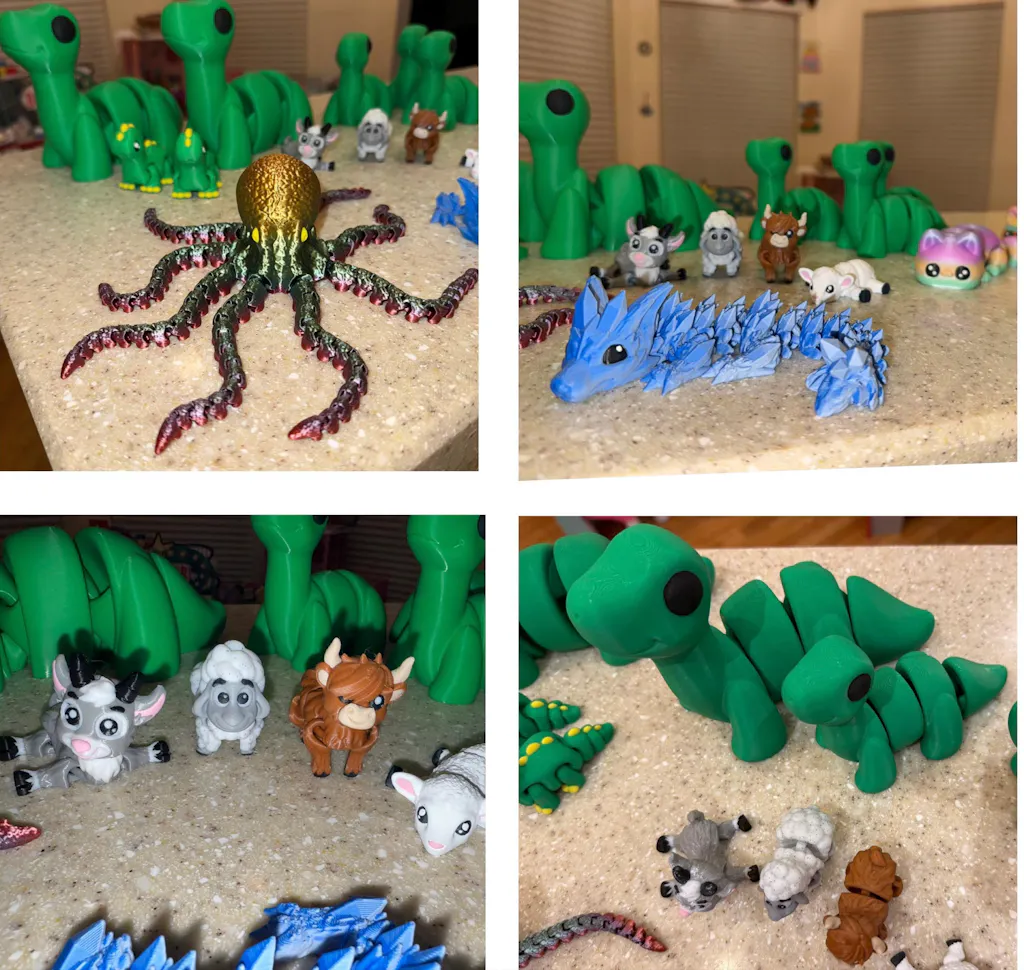 Each piece is 3D printed with attention to detail, often fully articulated to bend, twist, or pose in realistic ways. We use PLA, and designs range from whimsical fantasy (crystal dragons) to charming animal-themed figures for children and adults.